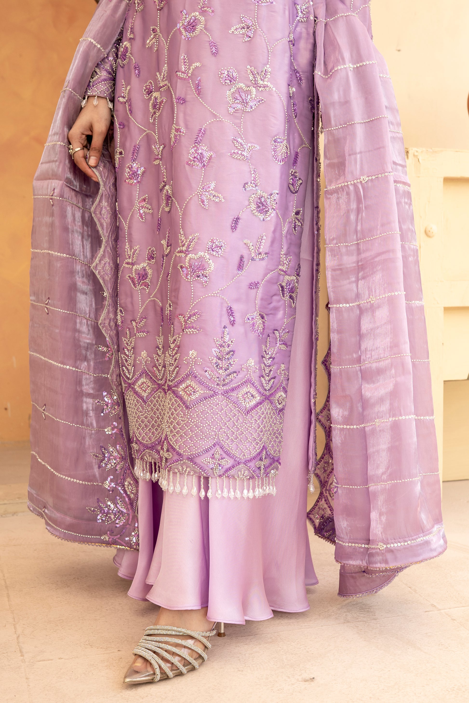 Experience the perfect blend of tradition and modern glamour. This 3-piece ready-to-wear ensemble is designed for weddings, Eid, and festive celebrations.
