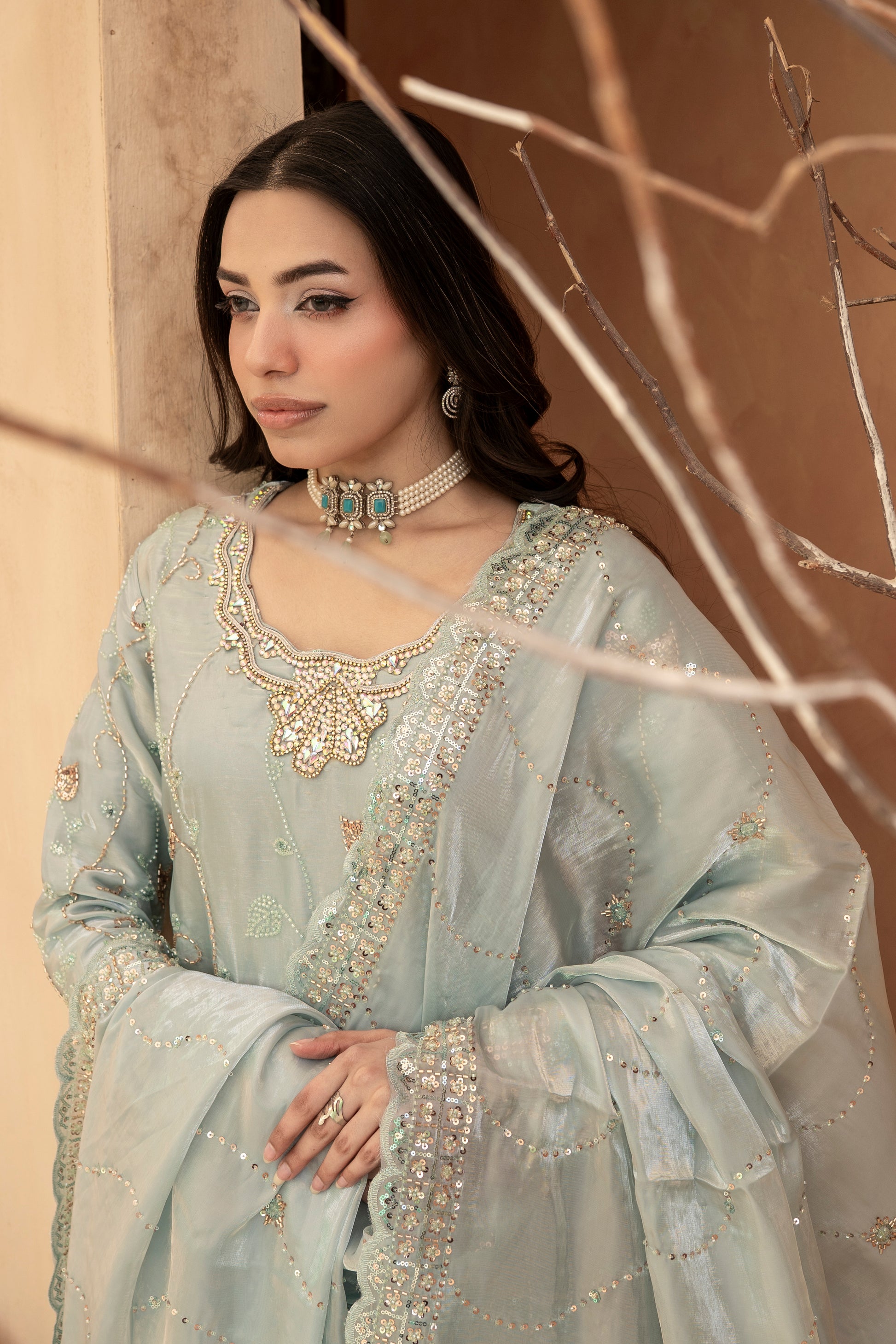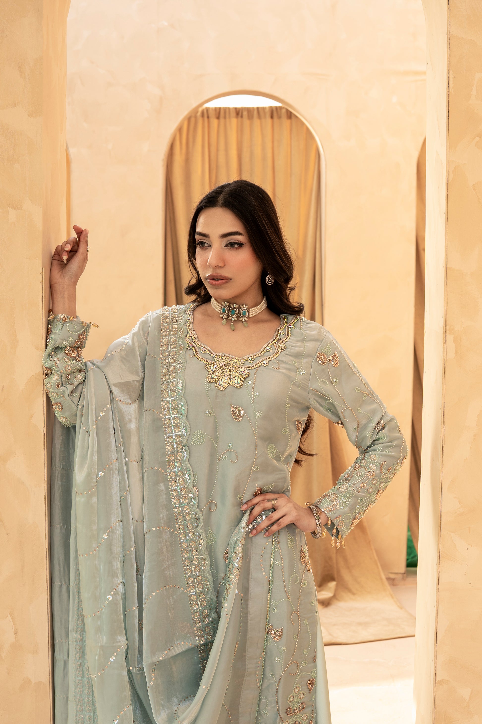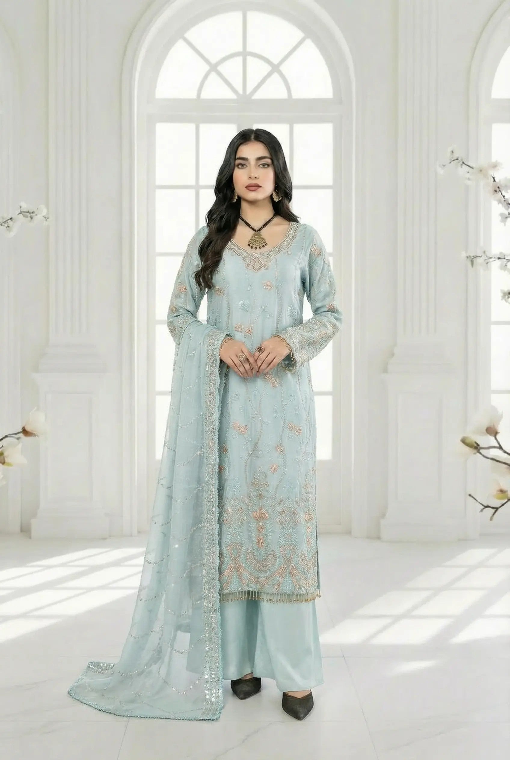Experience the perfect blend of tradition and modern glamour. This 3-piece ready-to-wear ensemble is designed for weddings, Eid, and festive celebrations.