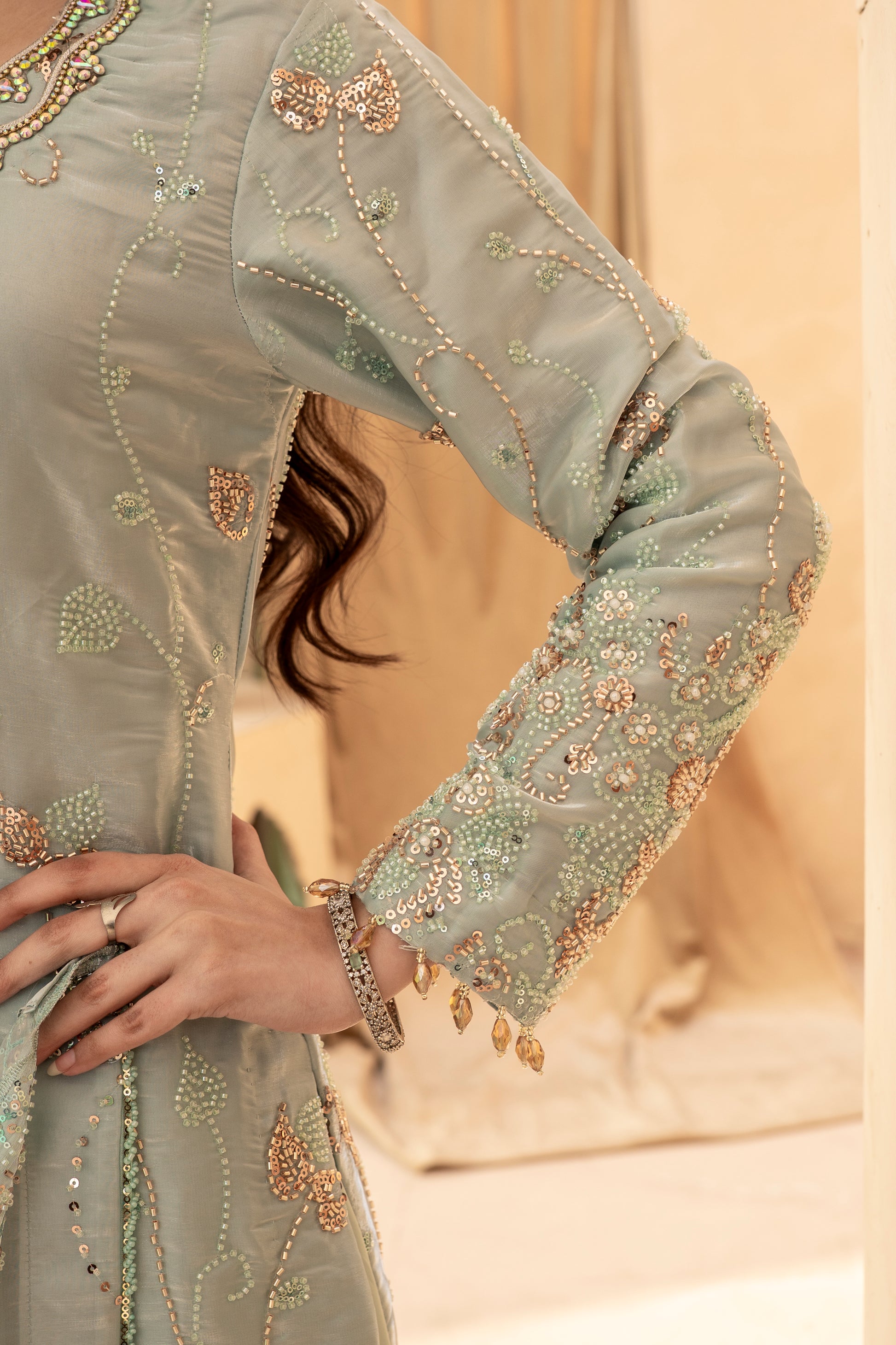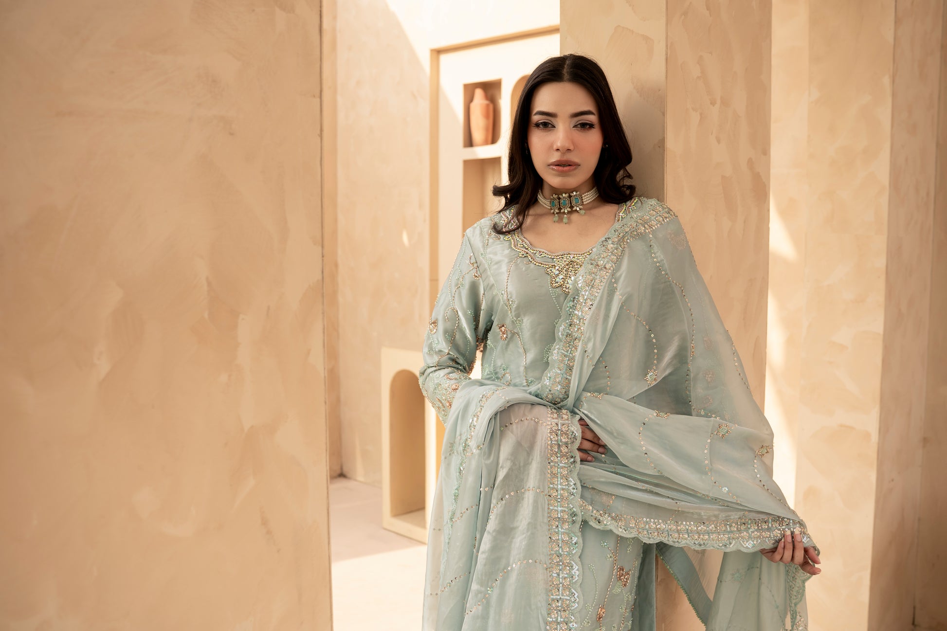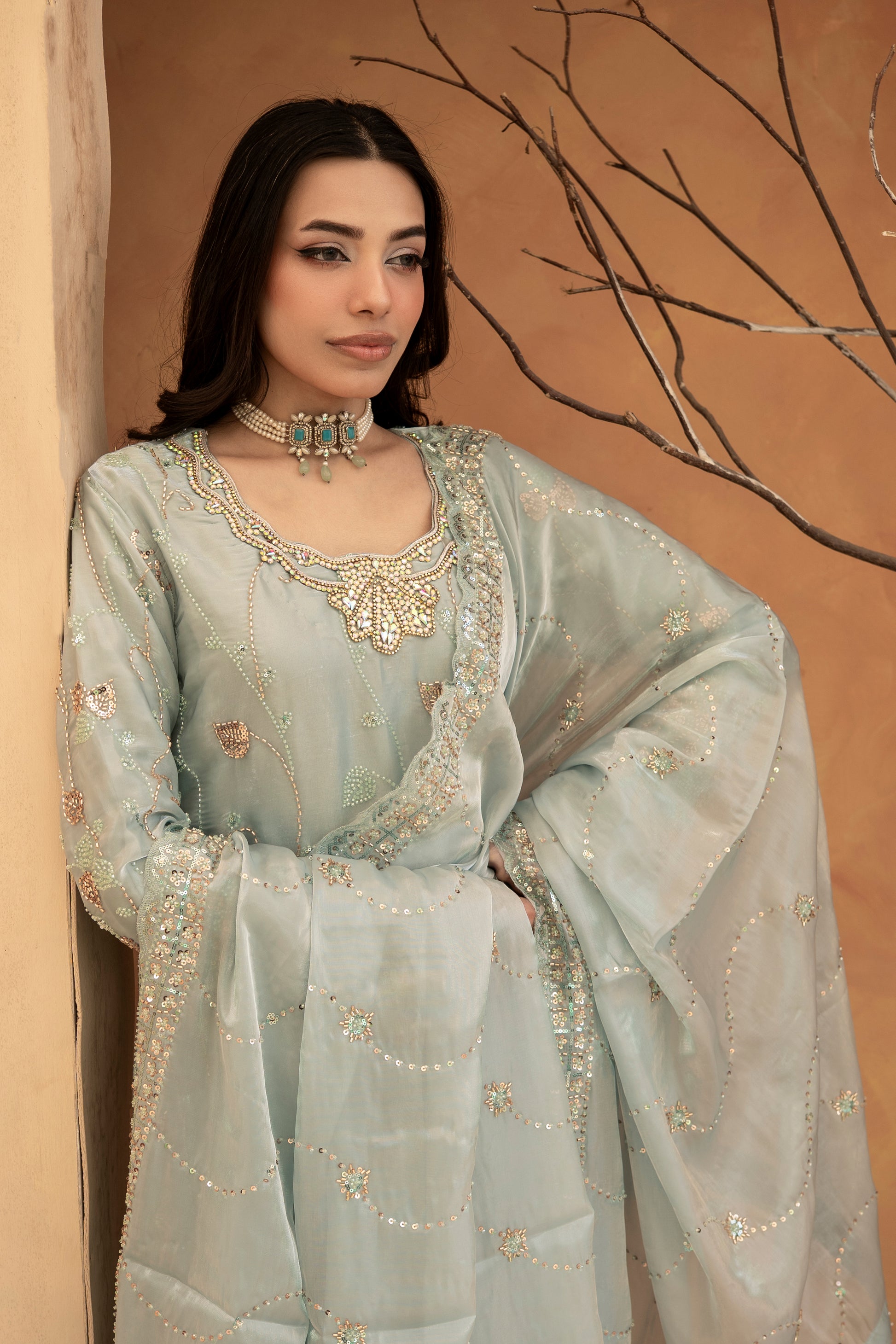 Experience the perfect blend of tradition and modern glamour. This 3-piece ready-to-wear ensemble is designed for weddings, Eid, and festive celebrations.
