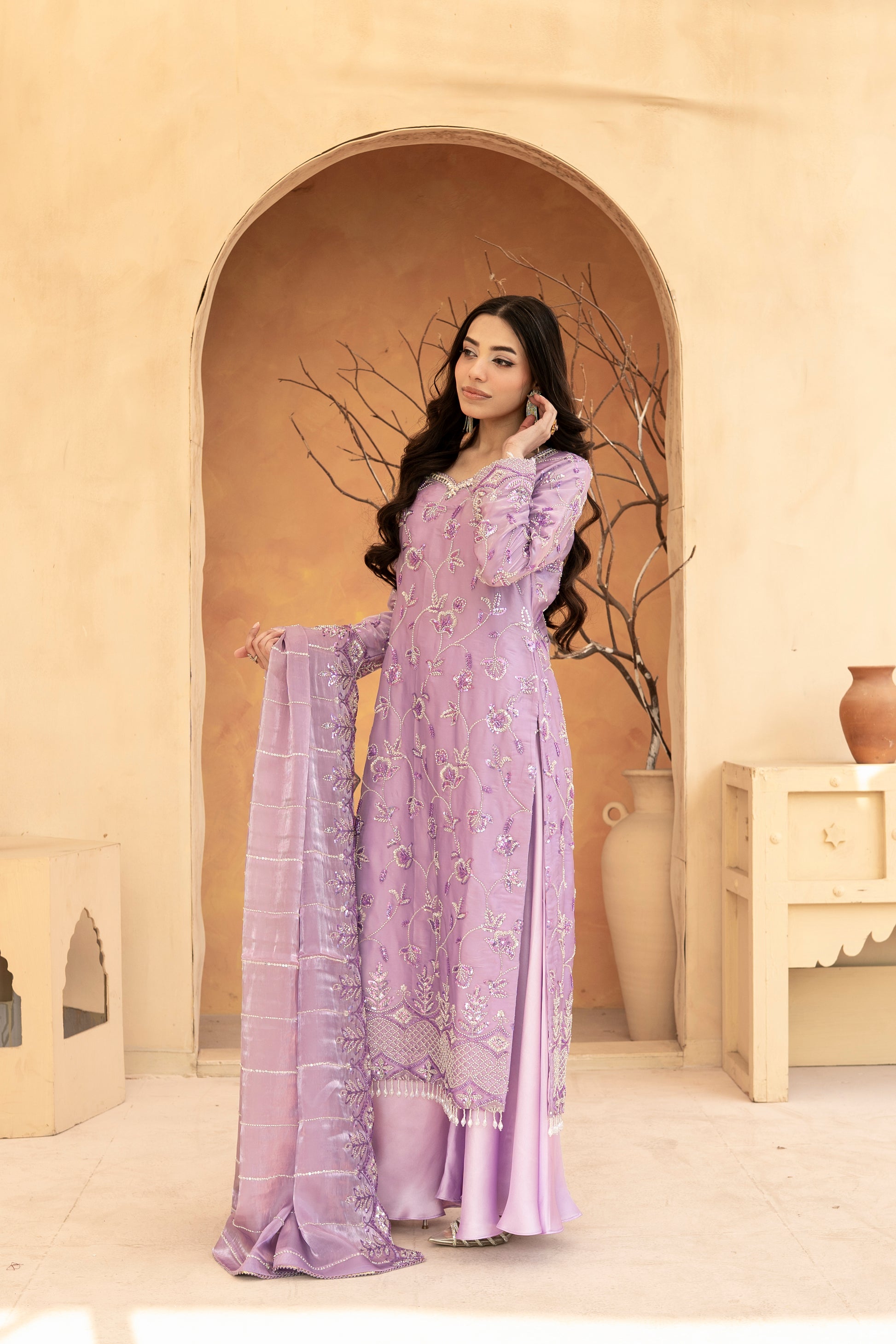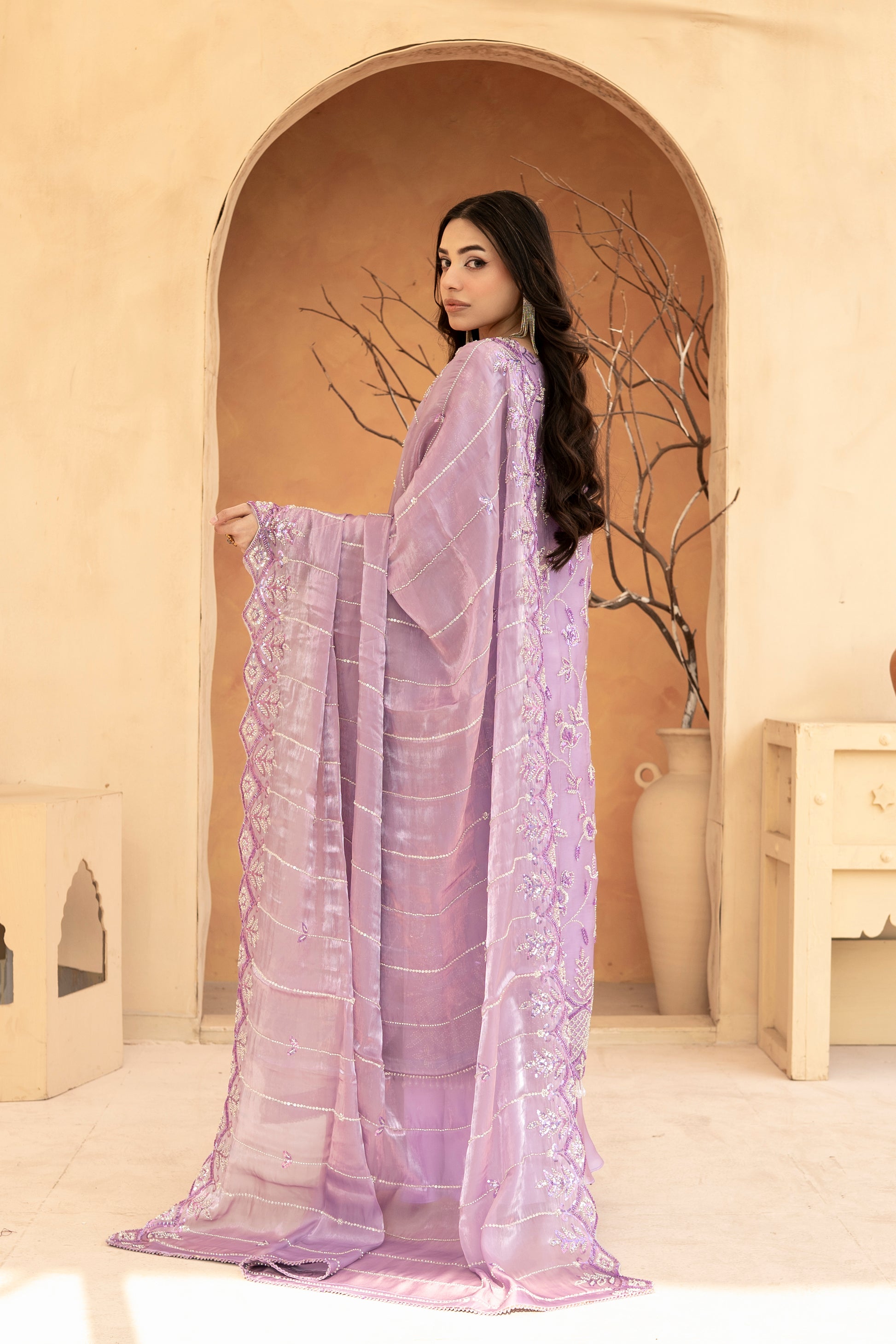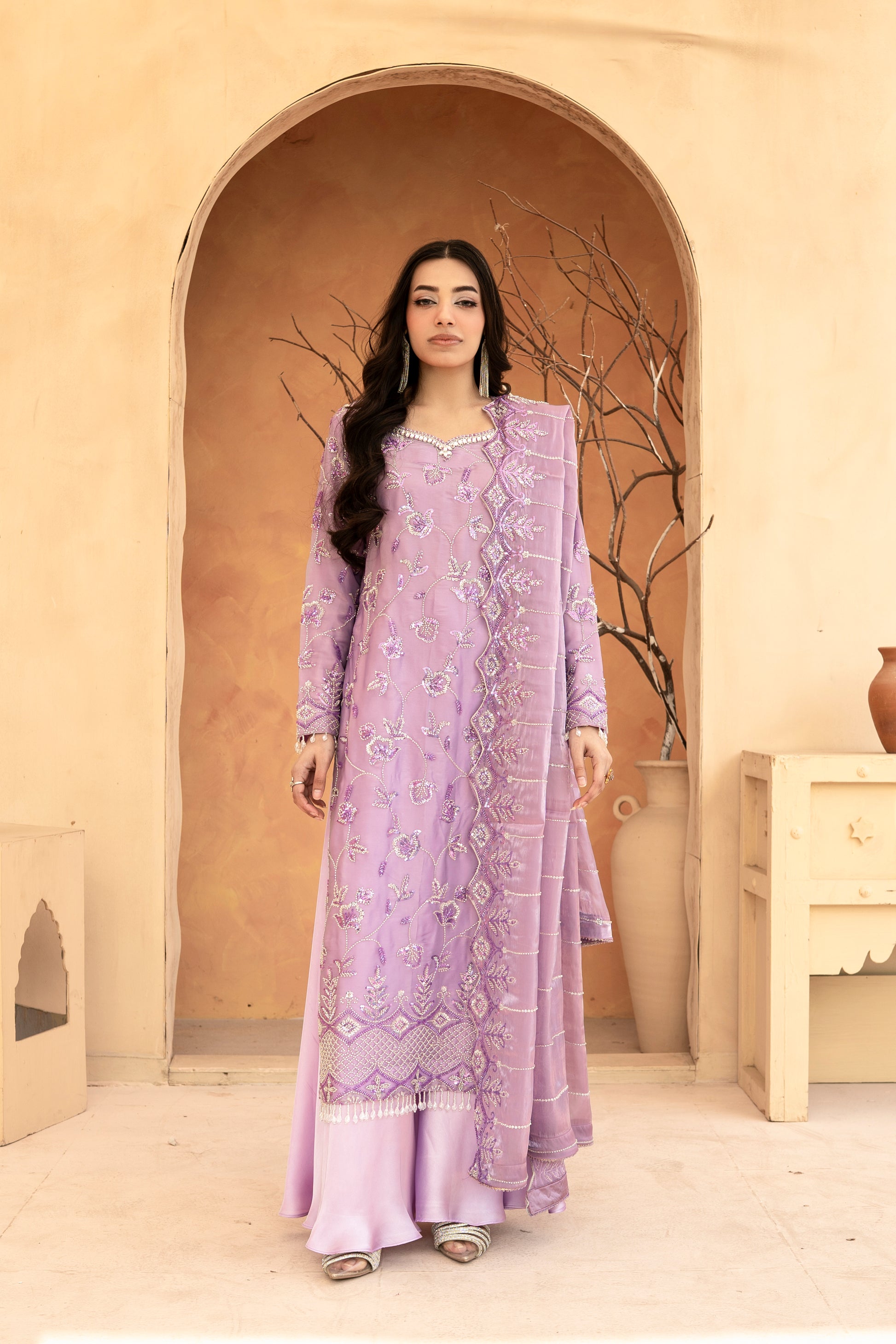 Experience the perfect blend of tradition and modern glamour. This 3-piece ready-to-wear ensemble is designed for weddings, Eid, and festive celebrations.