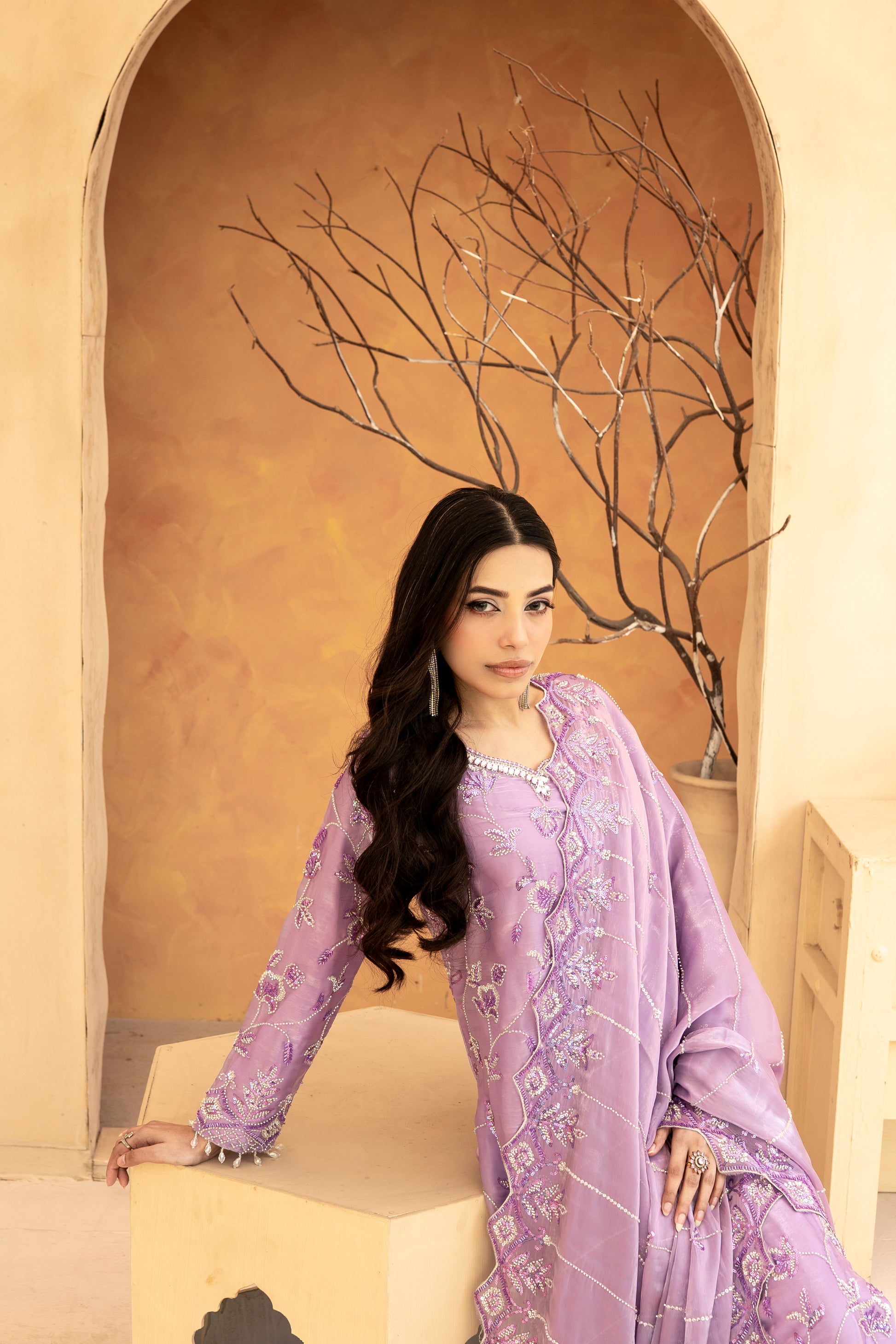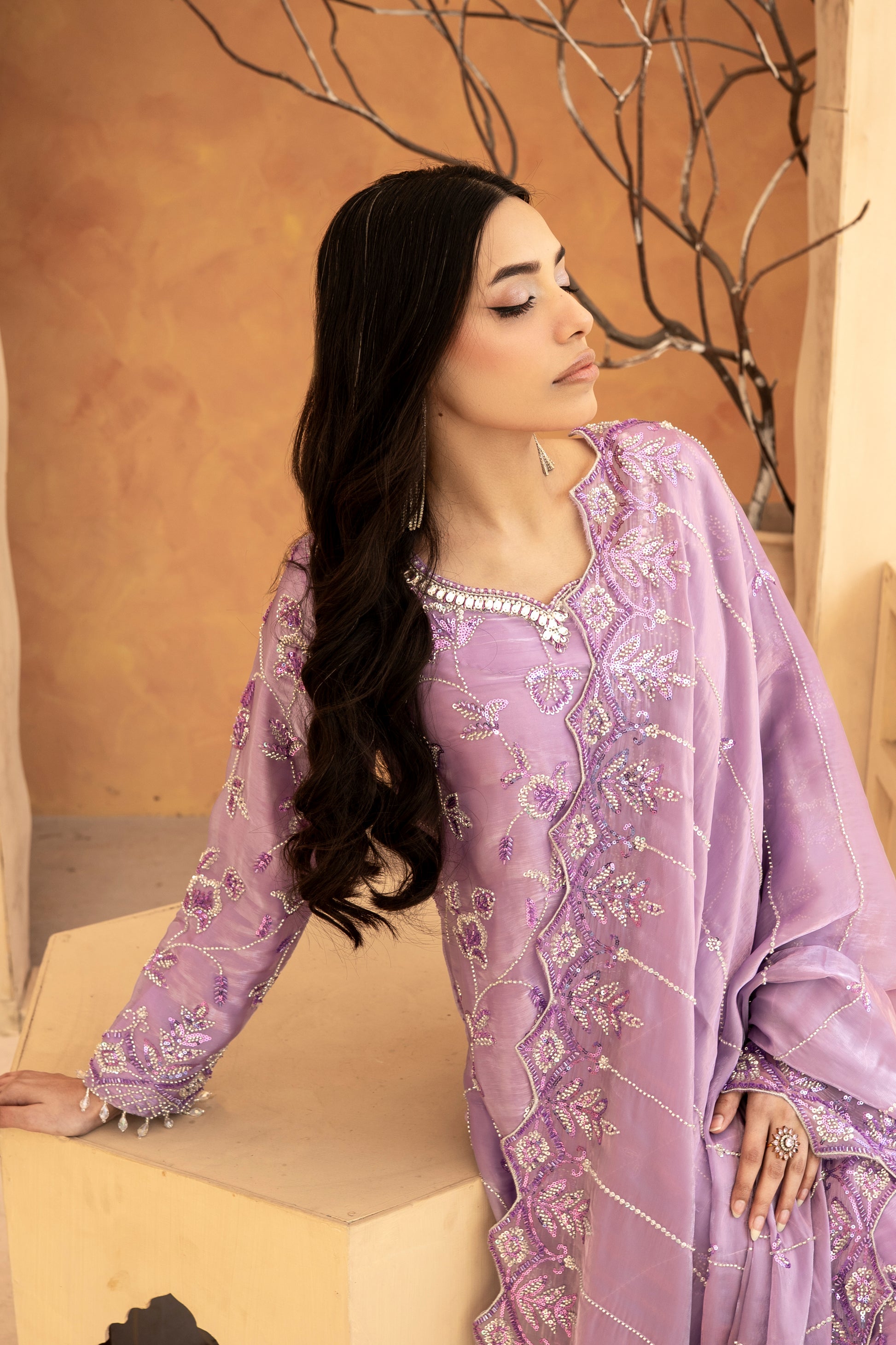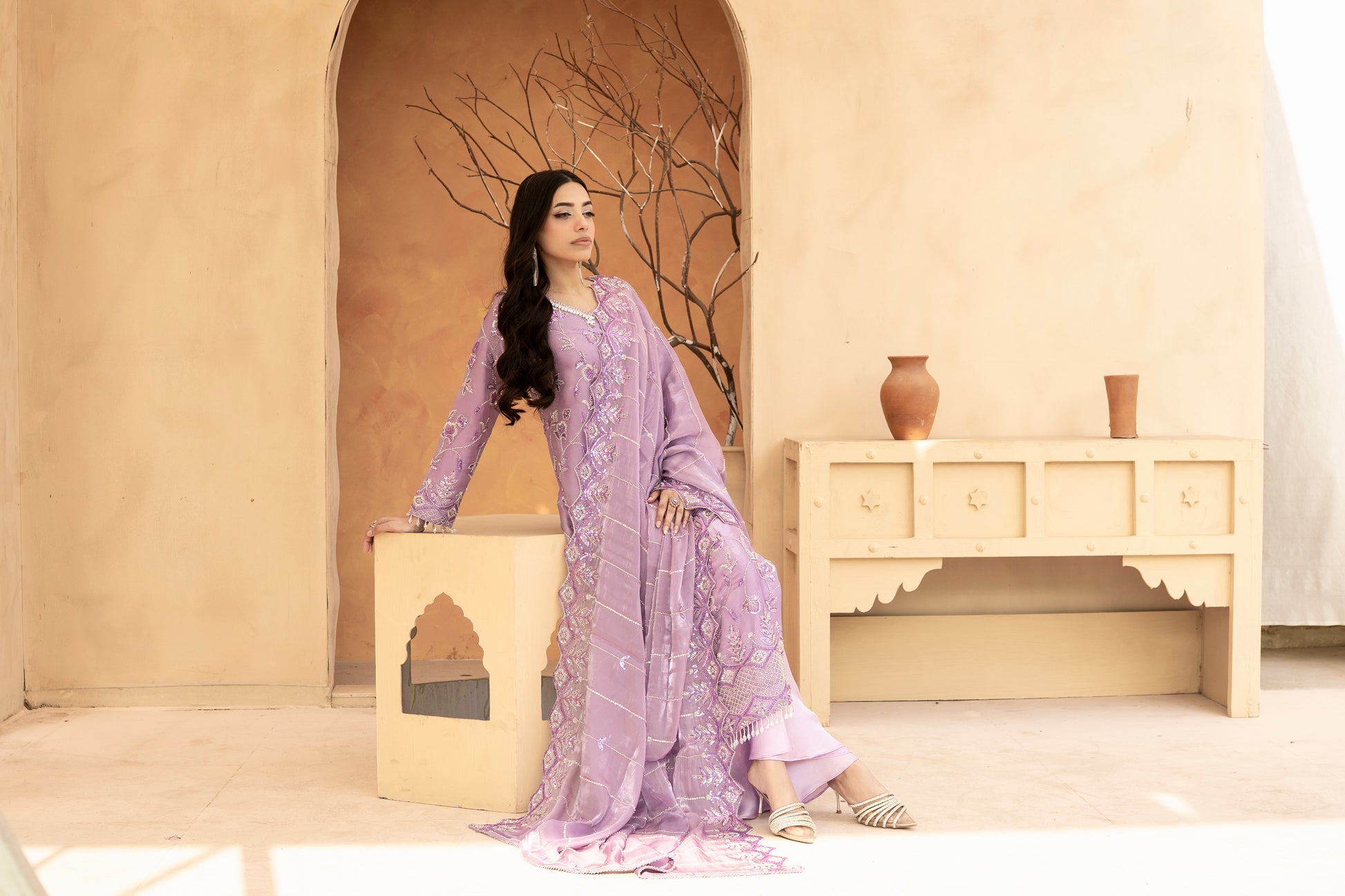 Experience the perfect blend of tradition and modern glamour. This 3-piece ready-to-wear ensemble is designed for weddings, Eid, and festive celebrations.