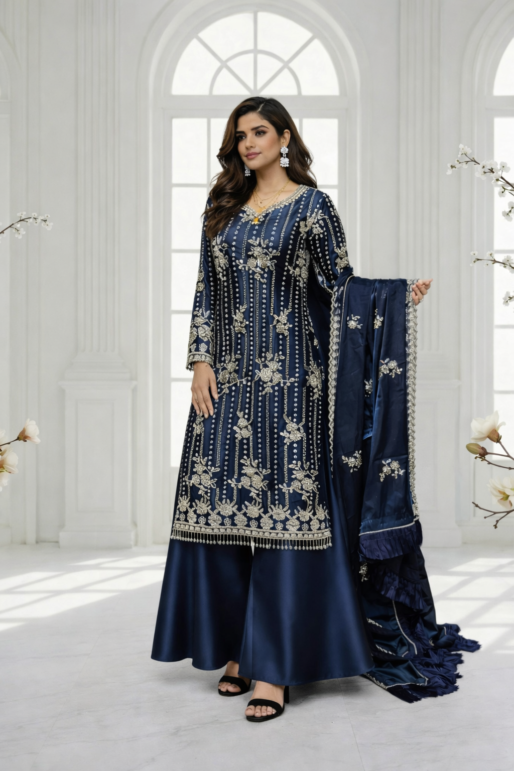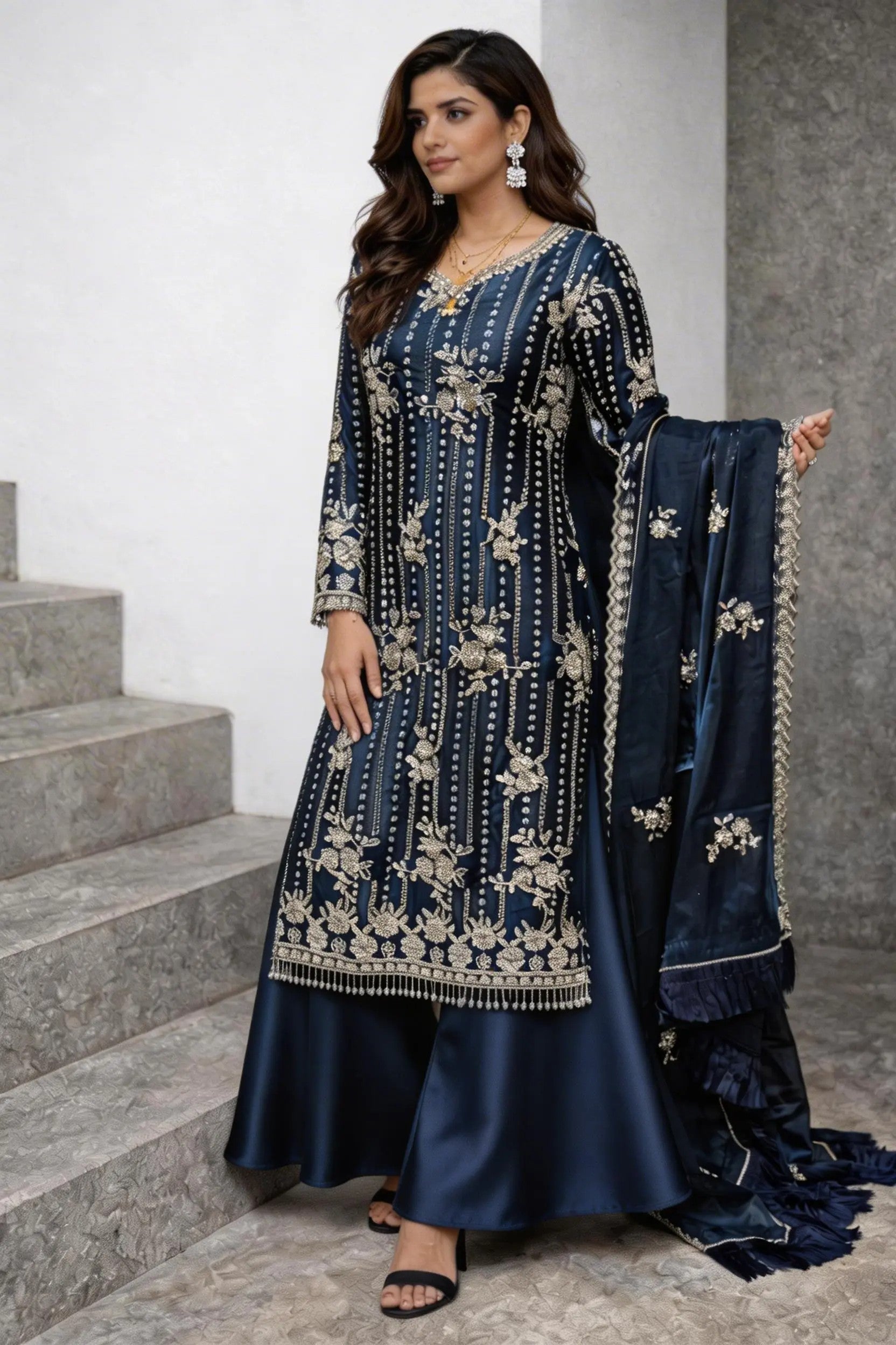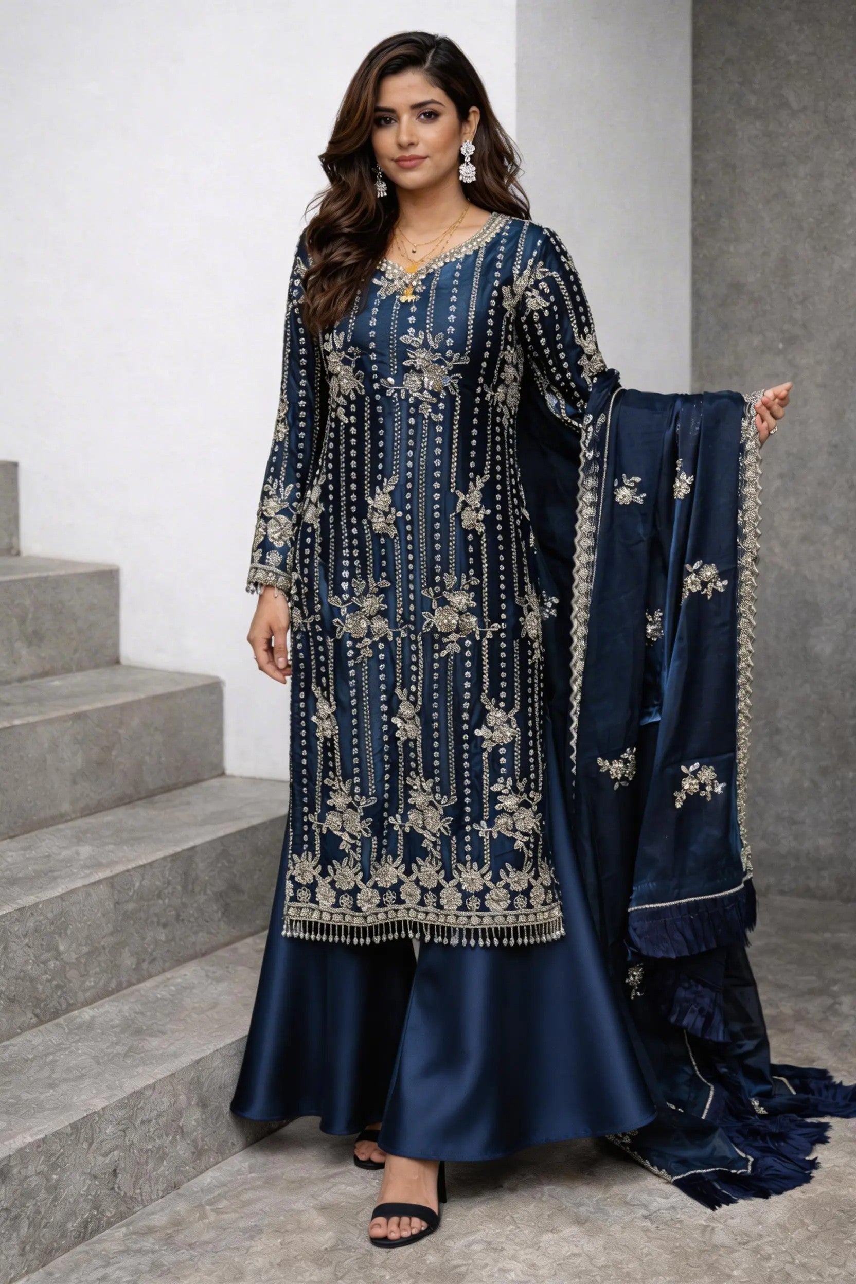 Experience the perfect blend of tradition and modern glamour. This 3-piece ready-to-wear ensemble is designed for weddings, Eid, and festive celebrations.