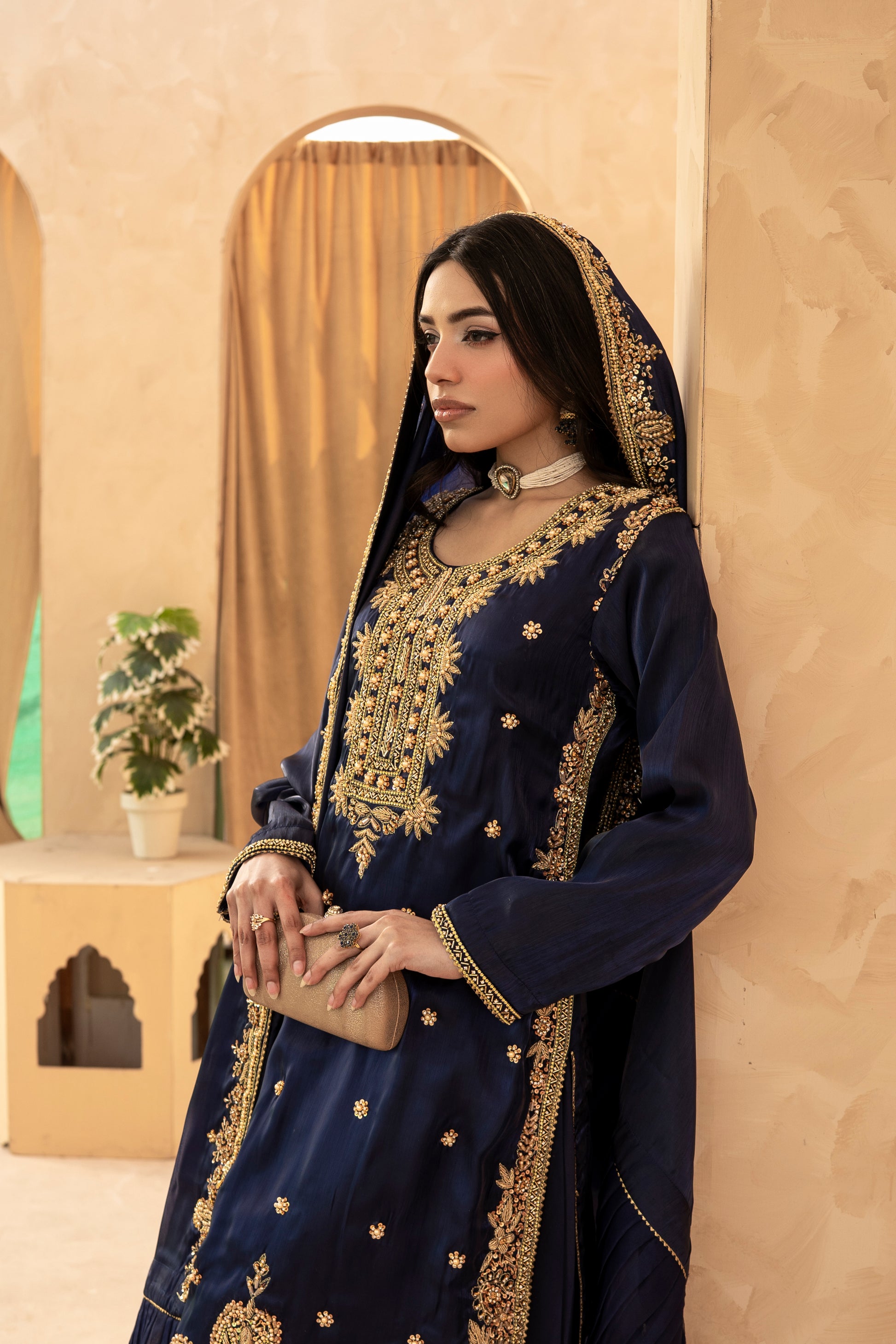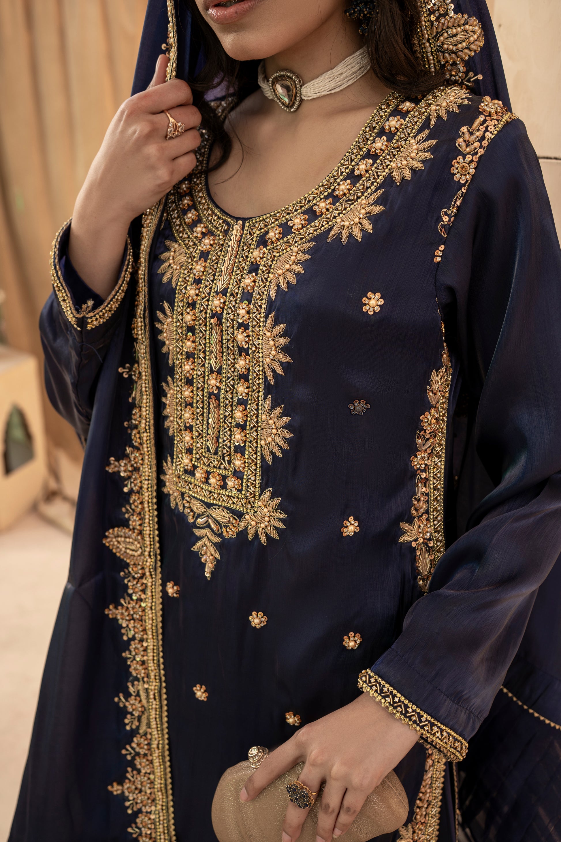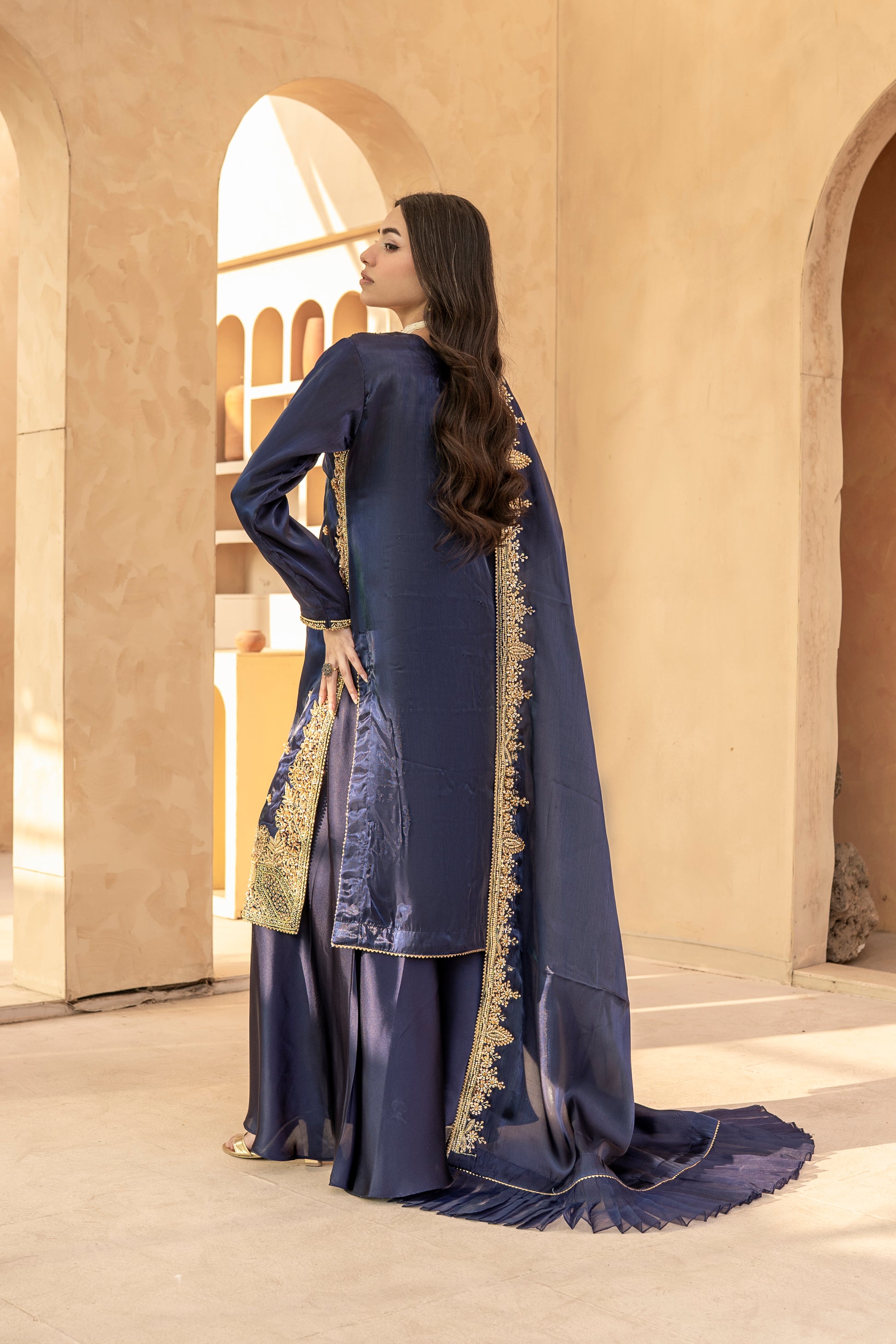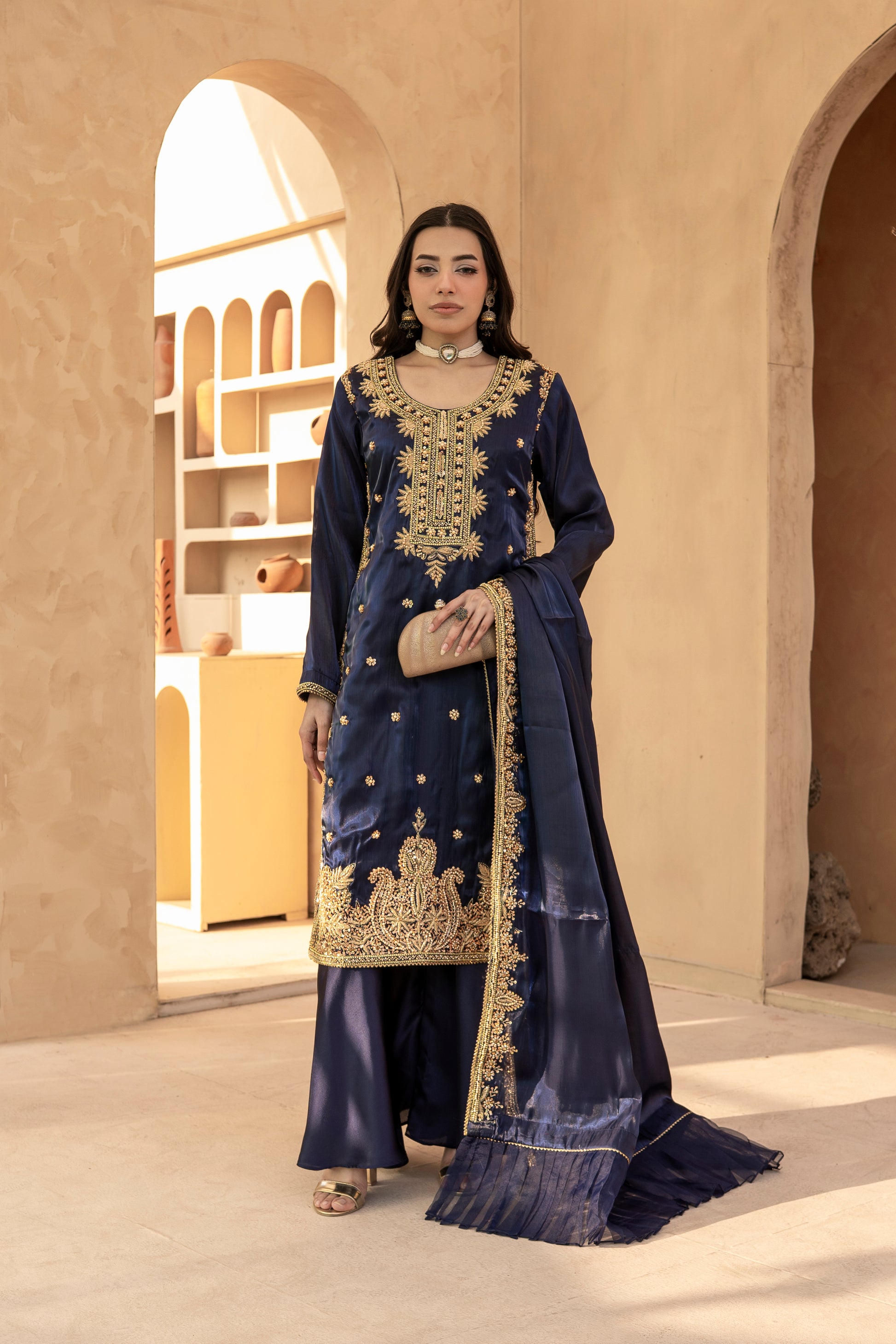 Experience the perfect blend of tradition and modern glamour. This 3-piece ready-to-wear ensemble is designed for weddings, Eid, and festive celebrations.