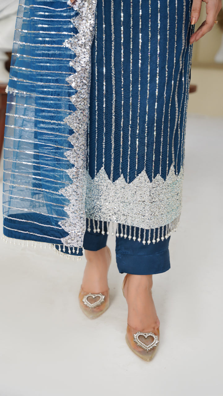 Dupatta: A matching chiffon dupatta with elegant frill detailing completes the look with subtle sophistication.